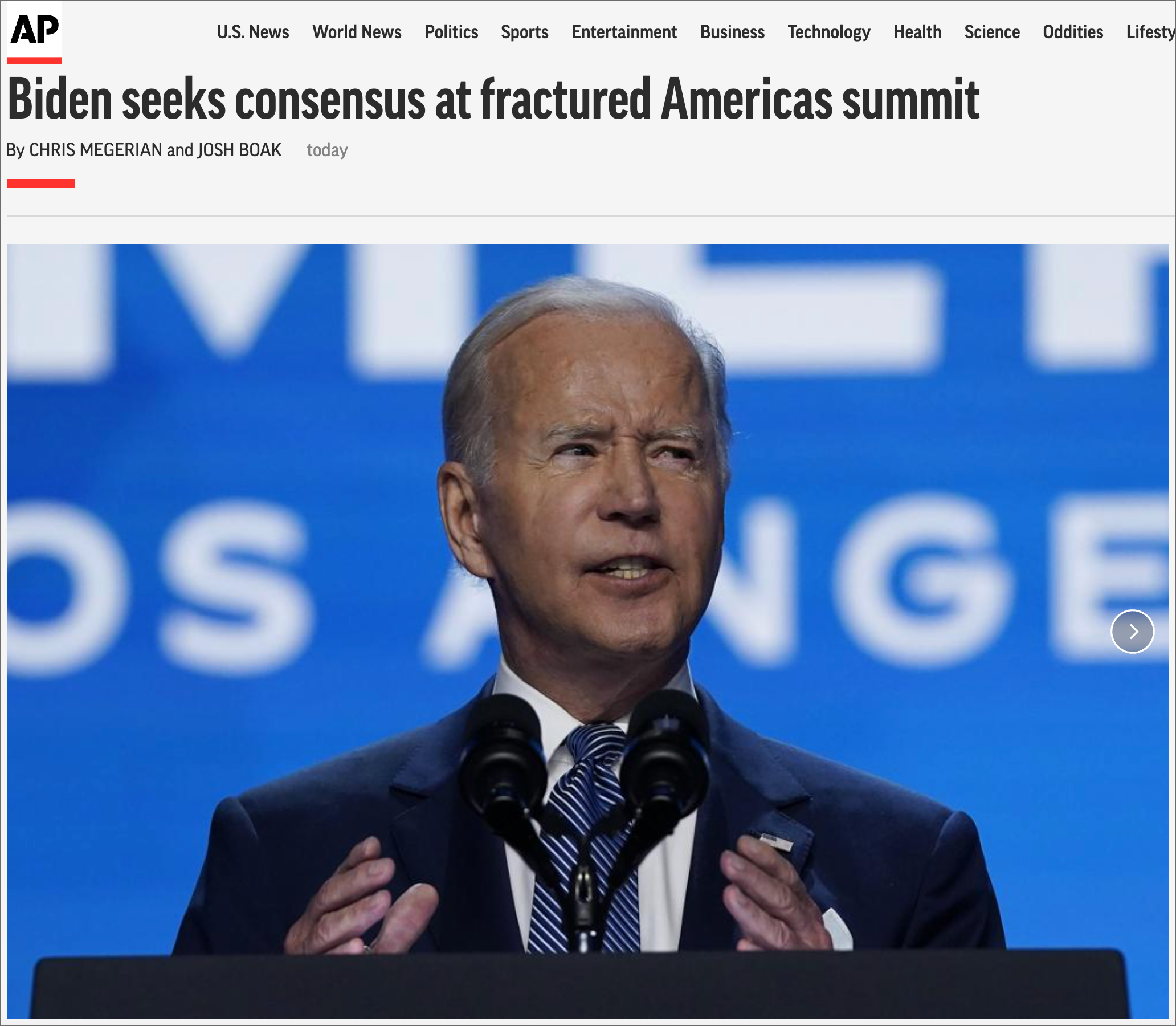 今年6月,美聯社報道稱:“拜登是在分裂的美洲峯會上尋求共識。”