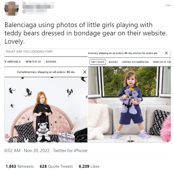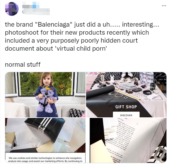 (觀察者網訊)兒童模特手拿穿有捆綁、束縛道具的小熊出鏡節日系列廣告,包袋廣告中出現美國最高法院一起關於未成年人色情製品的案件文件……因安插這些元素,奢侈品牌巴黎世家(Balenciaga)被質疑宣揚兒童色情,在國外社交平台遭到廣泛抵制。