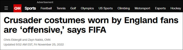 國際足聯(FIFA)告訴CNN,“在阿拉伯或中東背景下的‘十字軍’樣式服裝可能會對穆斯林造成冒犯。這就是為什麼反歧視的同事要求球迷把東西穿在裏面,或者換衣服”。