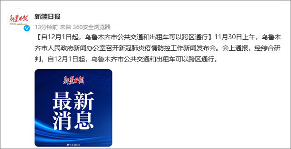 12月1日起,烏魯木齊市公共交通和出租車可以跨區通行 None 2022-11-30 據@新疆日報 ,11月30日上午,烏魯木齊市人民政府新聞辦公室召開新冠肺炎疫情防控工作新聞發佈會。會上通報,經綜合研判,自12月1日起,烏魯木齊市公共交通和出租車可以跨區通行。