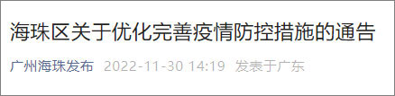 11月30日,微信公眾號“廣州海珠發佈”推送《海珠區關於優化完善疫情防控措施的通告》,全文如下。