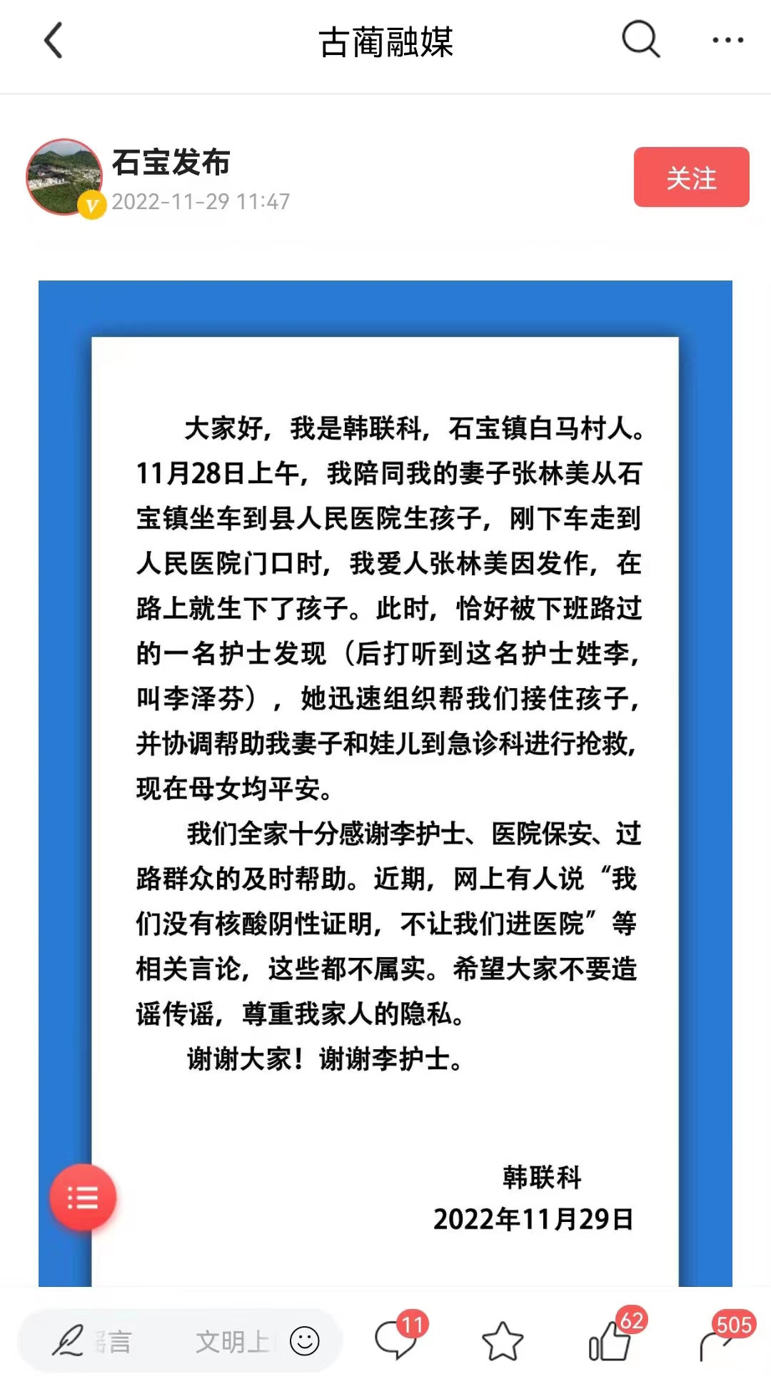 “我們全家十分感謝李護士、醫院保安、過路羣眾的及時幫助。近期,網上有人説‘我們沒有核酸陰性證明,不讓我們進醫院’等相關言論,這些都不屬實。希望大家不要造謠傳謠,尊重我家人的隱私。謝謝大家!謝謝李護士。”韓聯科聲明中説到。