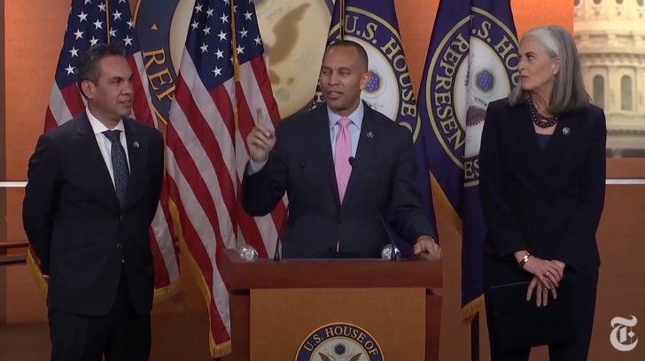 哈基姆·傑弗里斯(中)、凱瑟琳·克拉克(右)、皮特·阿吉拉爾(左)分別成為眾議院民主黨1、2、3號人物,將於明年1月接替佩洛西等人 視頻截圖