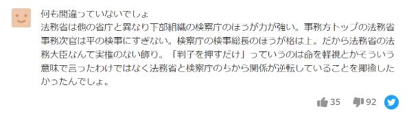 “法務省和其他部門不一樣,下面的檢察院權力反而大。法務省的事務官不過和檢察院的檢察官差不多,法務大臣也不過是裝飾而已。他發言説自己僅僅是蓋章的,搞不好是他想諷刺一下法務省和檢察院的不平等關係罷了。”