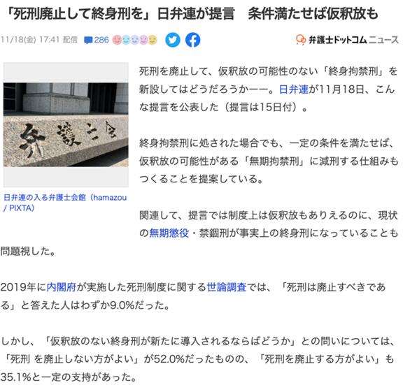 2022年11月15日,日本律師協會發出提案:希望日本增設“終身監禁”的刑罰,廢除死刑。但在這個提案中,該刑罰是可以假釋的。也就是説如果能夠獲得假釋,那這個刑罰就和無期徒刑一樣,在事實上讓日本取消死刑。