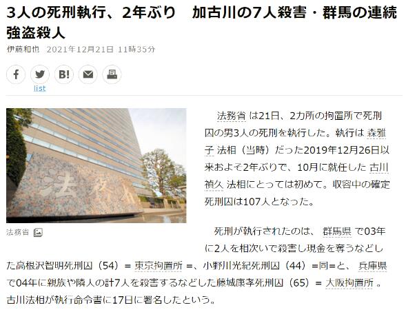 2021年也僅僅執行了3人的死刑,由時任法務大臣蓋章確認。這三人分別是兩名聯手於2003年連續兩次殺人的搶劫犯,以及一名於2004年把自己的家人和鄰居一起殺害、共計殺了7人的殺人犯。