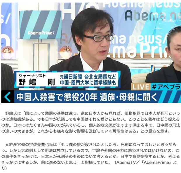 對於“江歌案”,日本媒體abemaTV進行了報道,參與特別節目的嘉賓是在廈門大學留過學的著名國際記者野島剛。他表示,每個國家都有自己的刑罰標準,例如日本就很難理解為什麼中國會有死刑。但國家之間的刑法差異,也會隨着日中兩國交流越來越多,而在將來產生各種各樣的影響。