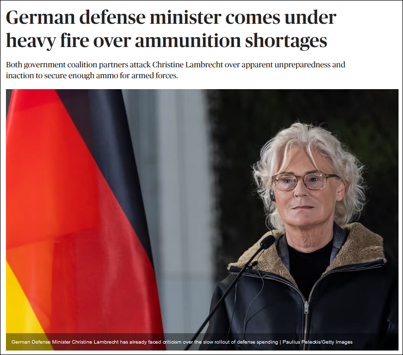 “政客”新聞網歐洲版:德國防長因彈藥短缺問題遭到猛烈抨擊,配圖為德國防長蘭布雷希特