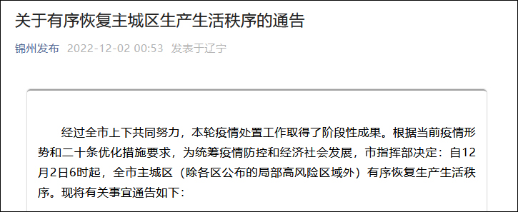 據微信公眾號“錦州發佈”12月2日消息,經過錦州全市上下共同努力,本輪疫情處置工作取得了階段性成果。根據當前疫情形勢和二十條優化措施要求,為統籌疫情防控和經濟社會發展,市指揮部決定:自12月2日6時起,全市主城區(除各區公佈的局部高風險區域外)有序恢復生產生活秩序。現將有關事宜通告如下: