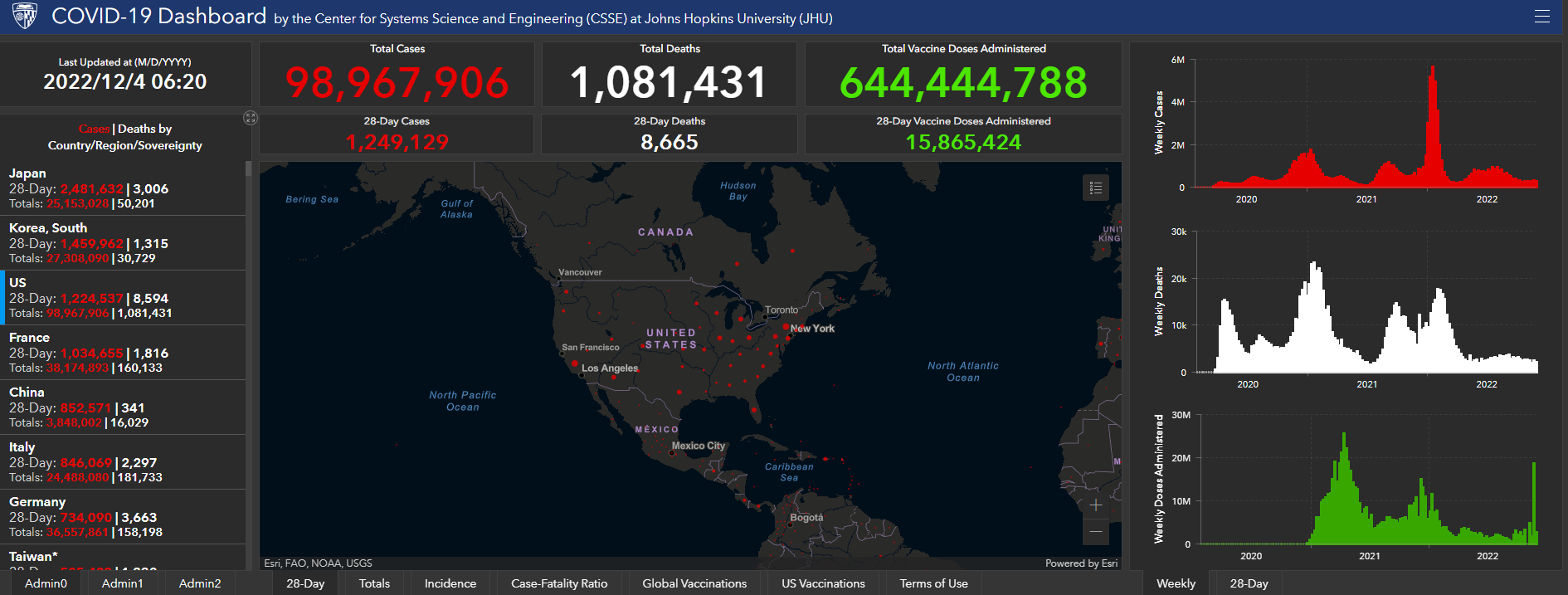 (觀察者網訊)根據美國約翰斯·霍普金斯大學統計數據,截至北京時間12月4日6時20分,美國新冠肺炎累計感染病例達到98967906例,累計死亡病例達1081431例。在過去約24小時內,美國新增感染病例30785例,新增死亡病例146例。