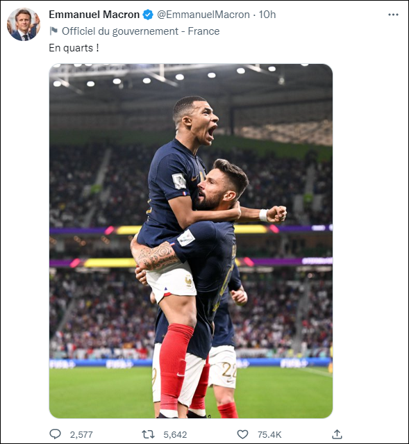 法國總統馬克龍也在賽後分享了一張吉魯與姆巴佩相擁慶祝的照片,祝賀法國隊成功晉級八強。