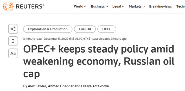 歐佩克+本次會議決定維持原先的減產路線不變,但值得一提的是,該次會議舉辦在西方對俄油限價令生效的前一天。