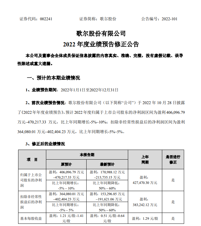 12月2日晚間,歌爾股份發佈公告,修正下調了2022年度業績預告,預計2022年實現歸母淨利潤17.1億元—21.37億元,較上年同期下降50%—60%。