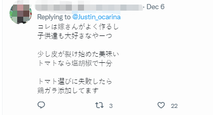 12月5日起,日本推特用户繪製的一張記錄西紅柿炒雞蛋做法的漫畫成為熱帖,發佈人稱,這是當過廚師的中國朋友教他的菜,簡單便宜又下飯。兩天不到,該條推特獲得了6.2萬點贊和近萬次轉發,評論區眾多日本網民交流炒這道菜的心得,感嘆中餐真是好做又美味。