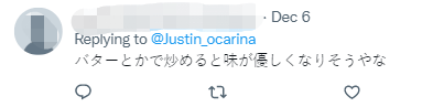12月5日,Justin在推特發佈了介紹西紅柿炒雞蛋的漫畫,配文稱這是“中國朋友(前專業廚師)做的中國菜”,並在評論區補充道,該菜也被稱為“番茄炒蛋”,是道“5分鐘就能完成的菜品”。