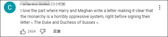 “我喜歡這個部分:哈里和梅根明確表示君主制是一個可怕的壓迫制度,然後他們不忘給自己的信上署名‘薩塞克斯公爵和公爵夫人’。”