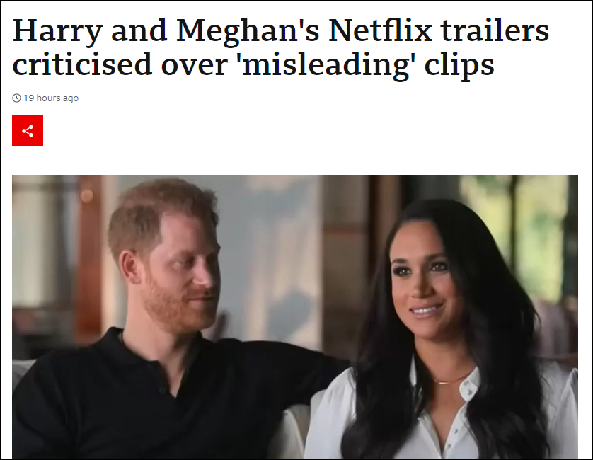然而,部分英國媒體對此的反應卻算不上友善。一方面,英國廣播公司(BBC)、《太陽報》、《每日郵報》等英媒紛紛開啓“找茬”模式,指出預告片中幾張展示哈里夫婦被媒體追逐的鏡頭與兩人並無關係,展示兩人被王室排擠的照片也經過剪裁從而斷章取義。BBC與《衞報》稱其為“誤導性”剪輯,《太陽報》則直呼預告片“造假”。另一方面,《每日郵報》等英媒還跟進報道預告片的負面評價,讓圍繞哈里夫婦這部紀錄片的爭議持續發酵。