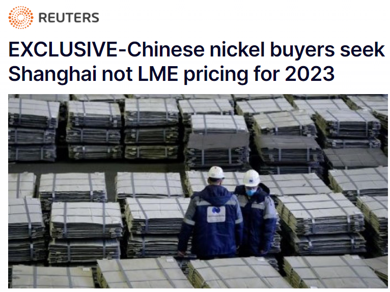 路透社12月7日,報道稱,兩位“瞭解情況的消息人士”表示,中國的鎳買家是全球最大的金屬買家,他們已要求生產商明年(2023年)使用上海期貨交易所 (SHFE) 合約為其供應定價。報道認為,“如果談判取得成功,將讓LME的市場地位進一步受到打擊。”