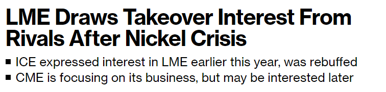 本月7日,彭博報道稱,ICE在過去20年引領了交易所行業的整合,倫敦國際石油交易所(IPE)、紐約期貨交易所(NYBOT)和紐約泛歐交易所(NYSE Euronext.)。據“知情人士”透露,如今ICE仍對LME有興趣。隨着鎳危機調查和訴訟的結果變得更加明朗,未來可能會重整旗鼓再次,嘗試收購LME。