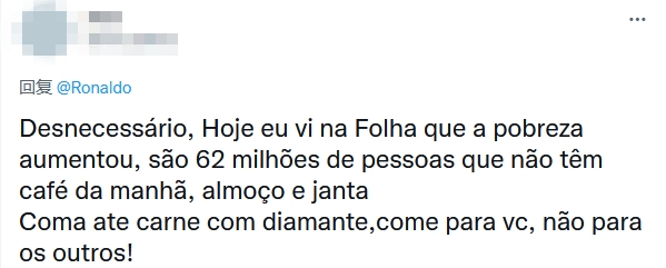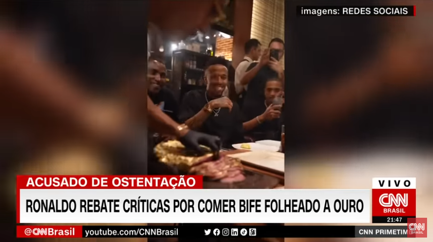 罵聲洶湧如潮,但羅納爾多在一檔電台節目上做出回應稱,他不認為請客聚餐吃昂貴牛排有任何錯誤,網上的仇恨言論是“嫉妒和懦弱的表現”,“我們吃金箔牛排與巴西有5000萬人捱餓有什麼關係?這就只是一種美食體驗,你在一個可能以後都不會再來的地方享受生活,這沒有錯。”