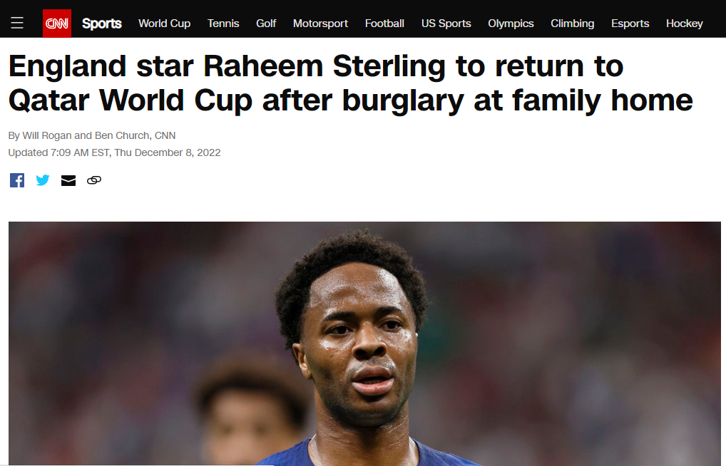 (觀察者網訊)綜合美國有線電視新聞網(CNN)和ESPN報道,英格蘭足球總會證實,此前因家中被盜而緊急返回英國的英格蘭邊鋒斯特林於12月9日歸隊報到。在英格蘭對陣法國的四分之一決賽前,這位技術能力在線的“快樂足球代言人”趕回了卡塔爾。