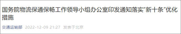 據微信公眾號“交通運輸部”,12月9日,國務院物流保通保暢工作領導小組辦公室印發通知落實“新十條”優化措施。