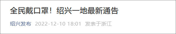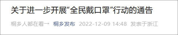 12月9日,微信公眾號“桐鄉發佈”發文《關於進一步開展“全民戴口罩”行動的通告》,其中寫道:廣大市民羣眾、外來人員應當好自身健康第一責任人,把佩戴口罩當成一種義務,當作日常生活標配,切實做到“應戴盡戴”“凡進必戴”“規範佩戴”。