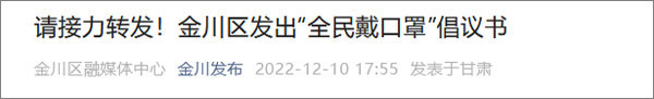 以四川阿壩州金川縣為例,其發佈的“倡議書”內容包括:一、提高認識,自覺佩戴口罩;二、注意方法,規範佩戴口罩;三、公共場所,全程佩戴口罩;四、重點人羣,必須佩戴口罩;五、做好表率,帶頭佩戴口罩;六、健康生活,養成文明習慣。