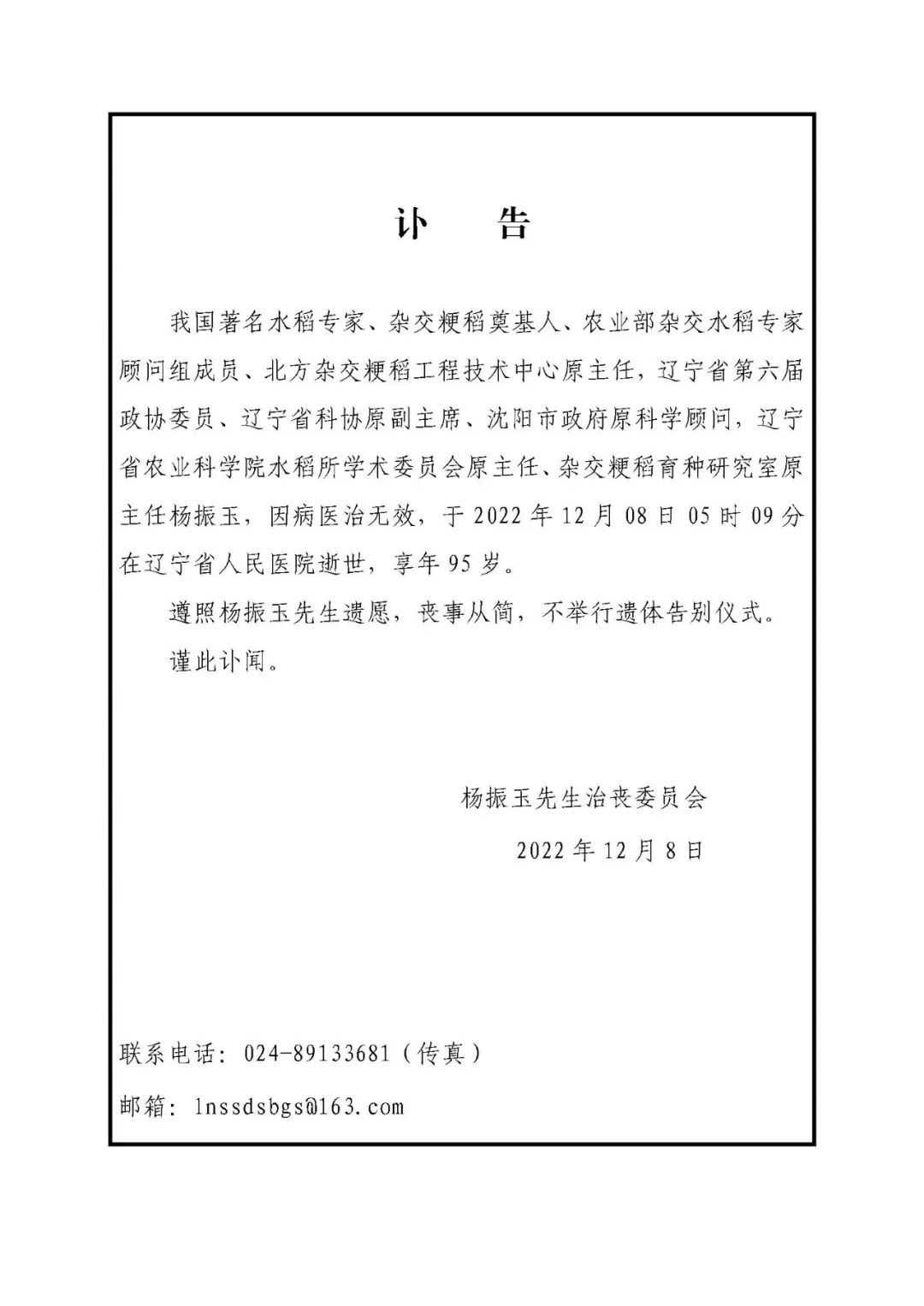 著名水稻專家楊振玉逝世 None 2022-12-11 據遼寧省農科院水稻所消息,著名水稻專家、雜交粳稻奠基人、遼寧省科技功勳獎獲得者、遼寧省農業科學院水稻所研究員、中共黨員楊振玉先生,因病醫治無效,於2022年12月8日5時09分在遼寧省人民醫院逝世,享年95歲。
