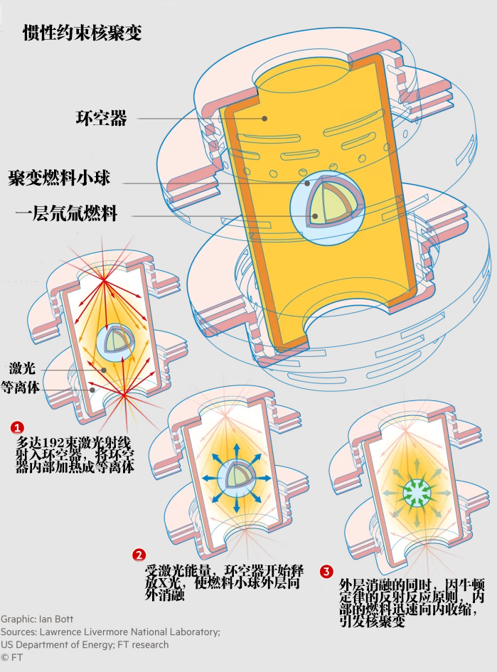 NIF就是採用了氘氚聚變路線。為了至少短時間內實現核聚變,NIF使用全世界最強的激光,通過192個射線,在幾納秒內輸送5萬億瓦功率的光能。激光的“靶子”,是一個名叫“環空器”的空腔,中間包含氘氚燃料。激光輸入的能量,使燃料温度達1億度,核聚變反應“點火”,從而產生能量,故名“國家點火裝置”。這一技術路線稱為“慣性約束聚變”。