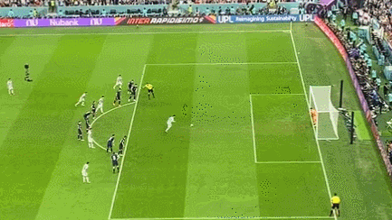 第32分鐘,阿根廷隊恩佐·費爾南德斯中場傳出過頂球,阿爾瓦雷斯插入禁區接應,挑射時被衝出來的克羅地亞門將利瓦科維奇撞倒。球此時已經挑過了門將,但被克羅地亞防守隊員攔在門外。