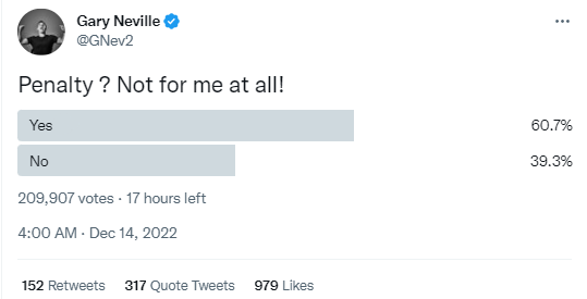 內維爾還在推特發起投票,想看看網民的看法。然而目前,支持判點球的人居多,佔60.7%。