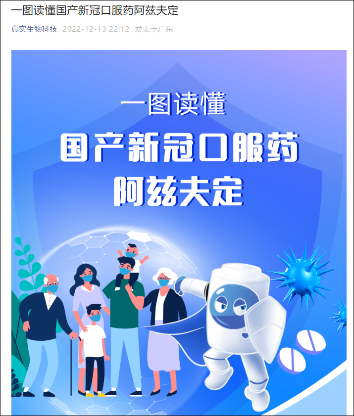 12月13日晚間,微信公眾號“真實生物科技”發佈文章介紹,阿茲夫定是我國首個具有完全自主知識產權的口服小分子新冠病毒治療藥物。
