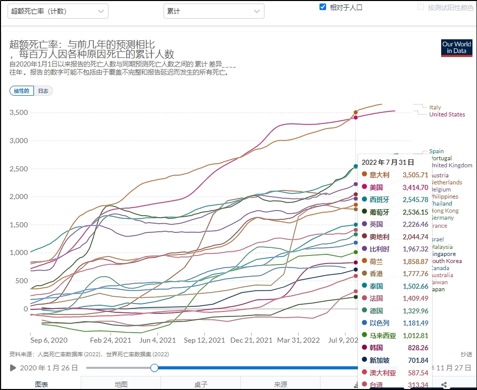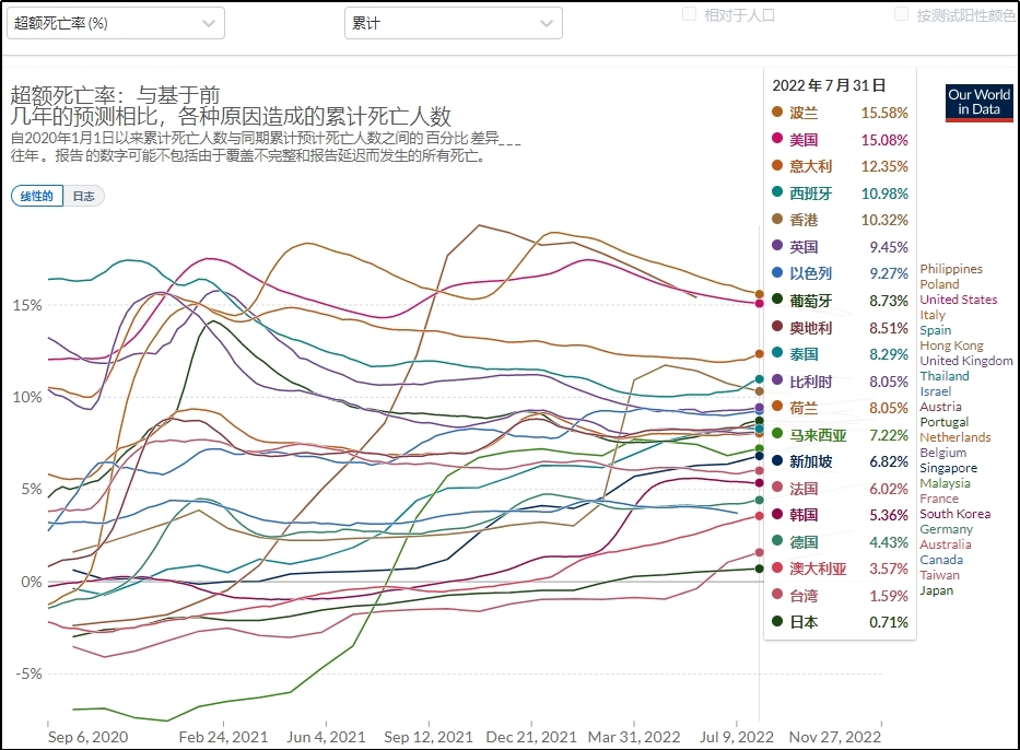最後兩張圖展示的是超額死亡率。一張是按人口加權後的絕對數,一張是無需加權的百分比,這個數據其實才能最準確地表達各國疫情的嚴重程度。可惜的是,該網站提供的該項數據嚴重不全,超過一半的國家都缺席,這種缺席自然也就造成了集體項目數據的不可能存在。但有數據的國家還是蠻多,為了圖能看清楚,筆者只選擇了儘量多的東亞國家和部分重要的西方國家,數據點沒有選在最後是因為那裏缺的數據還要更多。