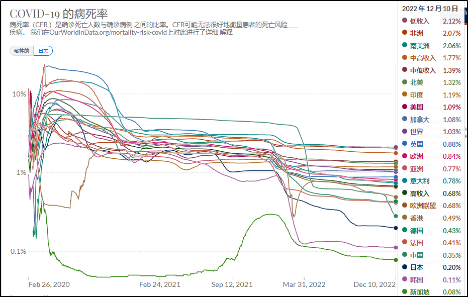 第三張圖展示的是隨着時間的遷移,病死率的整體下降趨勢。原始病株Alpha的世界平均死亡率是7.7%,德爾塔時代是2%,奧密克戎時代就只有1%左右了。注意這是累計的死亡率,後面的死亡率一直把前面高死亡率時死人的數據帶在裏面的。