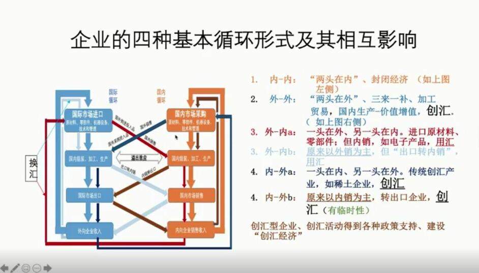 大循環是大量的進口加工和大量的出口形成循環。除了剛才我説的兩頭在外的形式和國內循環(在國內採購原材料、機器設備等,接着在國內加工生產和銷售,企業取得收入之後再從頭這麼做),還有一些小循環,比如“一頭在內,一頭在外”以及“一頭在外,一頭在內”的模式,這裏不一一説了。不過,我得強調一下,並不是所有企業的經濟活動都可以用循環這種概念來描述,這只是看問題的一個角度而已。