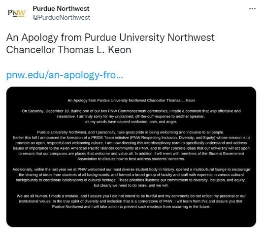 在致歉聲明中,基翁聲稱自己和普渡大學西北校區一直在踐行多樣性、包容性和公平性的承諾,以期能在校園內推動開放、尊重和熱情友好的文化。他承諾自己會與校學生會成員見面,以討論如何更好地解決學生的關切。