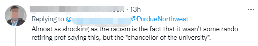 “和種族主義一樣令人震驚的是,説這話的不是某個退休教授,而是大學校長。”