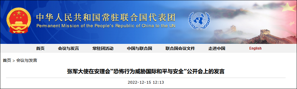 據中國常駐聯合國代表團網站12月15日消息,張軍大使在安理會“恐怖行為威脅國際和平與安全”公開會上發言。
