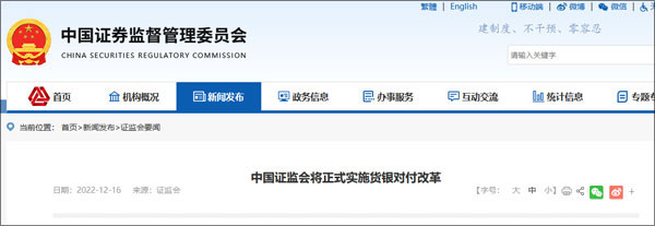 中國證監會將正式實施貨銀對付改革