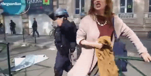 觀察者網查詢到,@伊朗駐華大使館 所附視頻中的事件發生在2016年5月,時任法國總統奧朗德力推的勞工改革法案當時引起了法國民眾的示威抗議。英國《衞報》在報道這一幕時稱,抗議期間,在法國西南部城市圖盧茲街頭,一名女子被一名警察推倒在地。