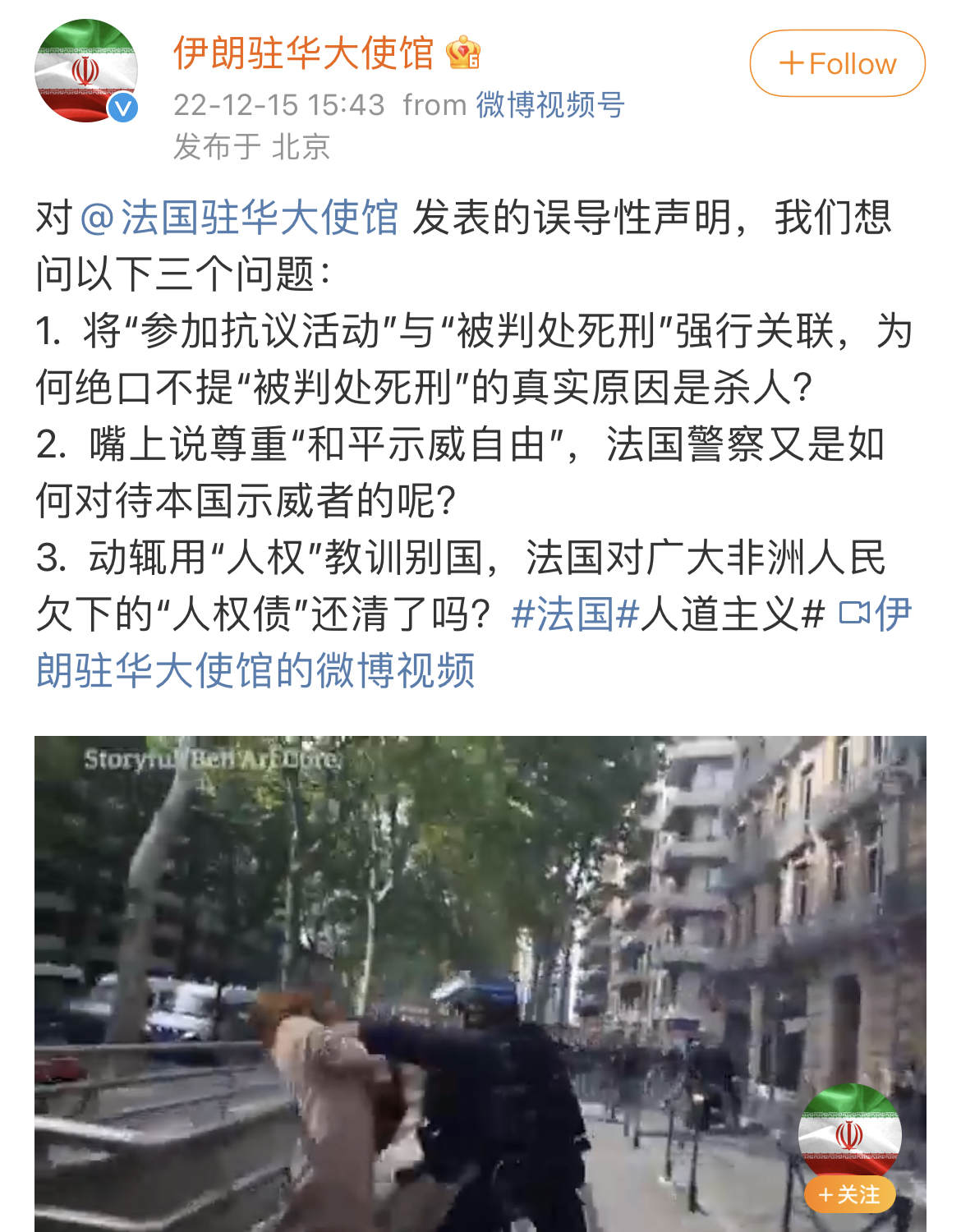 (觀察者網訊)繼日前在微博駁斥西方媒體關於“伊朗球員因支持女性將被處決”的報道後,北京時間12月15日下午,@伊朗駐華大使館 又與@法國駐華大使館 直接對線,指責後者“譴責處決兩名參與抗議活動的伊朗人”的聲明具有“誤導性”,並三問@法國駐華大使館,諷刺其人權審視對人不對己。