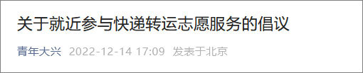 據微信公眾號“青年大興”,北京市大興區於12月14日發佈《關於就近參與快遞轉運志願服務的倡議》。