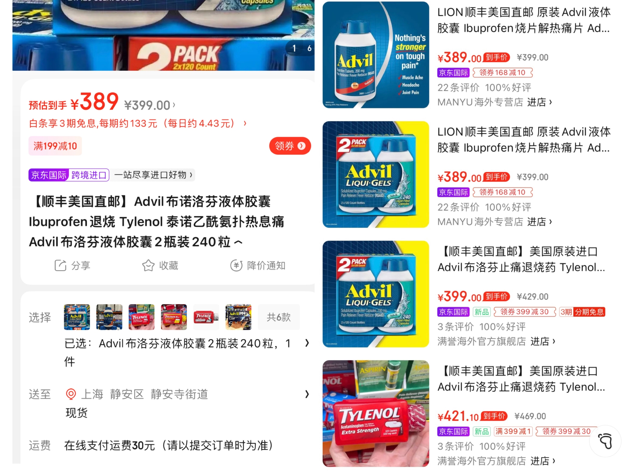 記者在京東查詢發現,同樣兩瓶裝的Advil布洛芬液體膠囊,京東國際的價格在378元、389元不等,Tylenol乙酰氨基分緩釋片325片的價格在388元、421元不等。兩款產品都顯示美國順豐直郵,一個訂單限購一瓶,還需另外支付國際運費25-30元左右,到貨時效在2-3周。