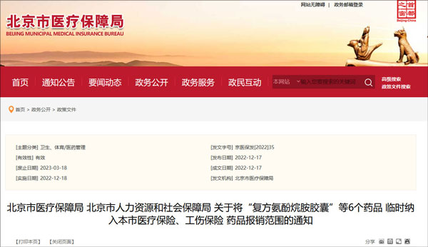 北京將“複方氨酚烷胺膠囊”等6個藥品臨時納入醫保等藥品報銷範圍