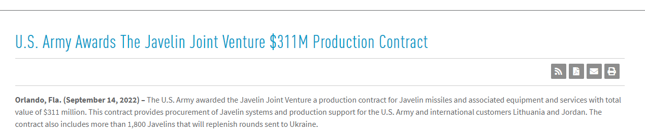 有消耗就得有補充,雷神公司的首席執行官雷格·海耶斯日前對媒體表示,在俄烏衝突的10個月中,美國已經因為在軍事上援助烏克蘭,消耗了太多的武器裝備庫存:雷神公司13年間生產的“毒刺”單兵防空導彈,已經被消耗殆盡。他呼籲美國政府儘快“投資工業基礎”,增加“標槍”等反坦克導彈的產量。洛·馬公司現階段年產“標槍”導彈2000枚,計劃將這一數字增至4000枚。而實現這一目標需數年時間和投資。