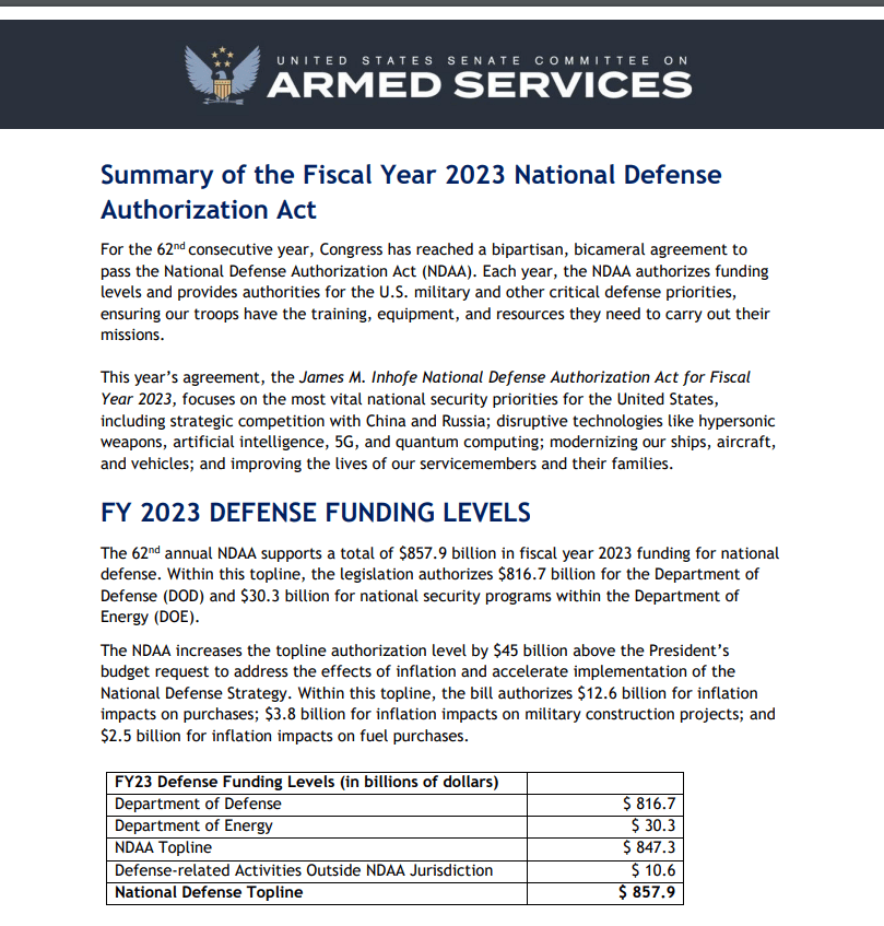 最後不要忘了,俄烏衝突引發的“焦慮”盡頭最終還是反饋到了美國自己身上——史無前例的2023財年美國軍費。美國國會參議院通過了總額高達8580億美元的國防授權法案(NDAA),比總統拜登提議的預算還多出450億美元。比去年的NDAA法案更是高出了780億美元——換言之,僅僅比去年多出來的部分,就是美國今年援烏裝備總價格的兩倍還多。根據美軍軍費經驗比例,這其中至少一半的錢將落入軍工複合體之手。