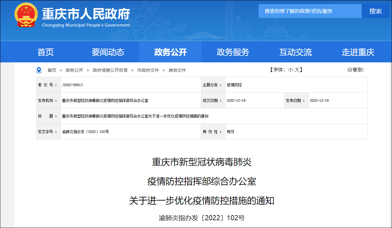 重慶市衞健委官網消息,12月18日,重慶市新型冠狀病毒肺炎疫情防控指揮部綜合辦公室發佈關於進一步優化疫情防控措施的通知。