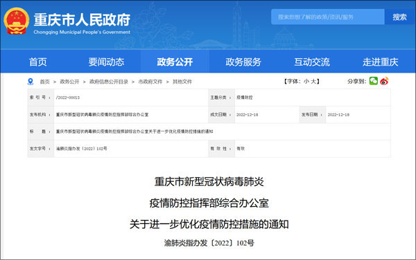 據重慶市人民政府網,12月18日,其發佈《關於進一步優化疫情防控措施的通知》。