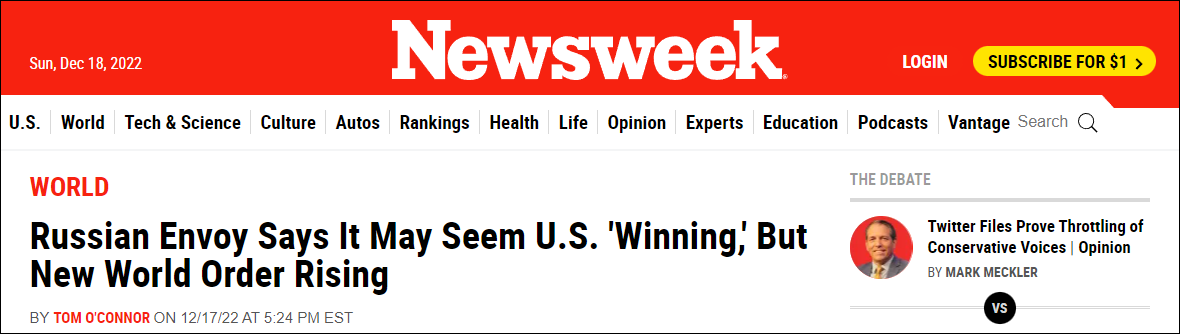 而在當地時間12月9日,白宮方面宣佈,美國總統拜登已經批准再向烏克蘭提供2.75億美元的軍事援助,幫助烏軍獲得更多的彈藥和防空能力。在此約一週後,俄駐美大使安東諾夫接受《新聞週刊》採訪,認為美國“似乎需要不斷通過與俄羅斯的競爭來自我肯定”。